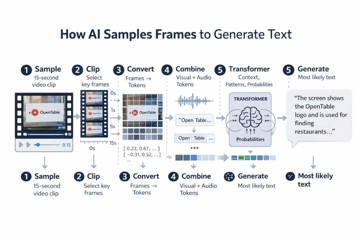 Each frame is then broken into smaller regions and converted into numerical representations that the model can process. If there’s audio, spoken words are transcribed into text and aligned with those frames. By the time the model begins “analyzing,” the video has already been reduced to a combination of image fragments and text.