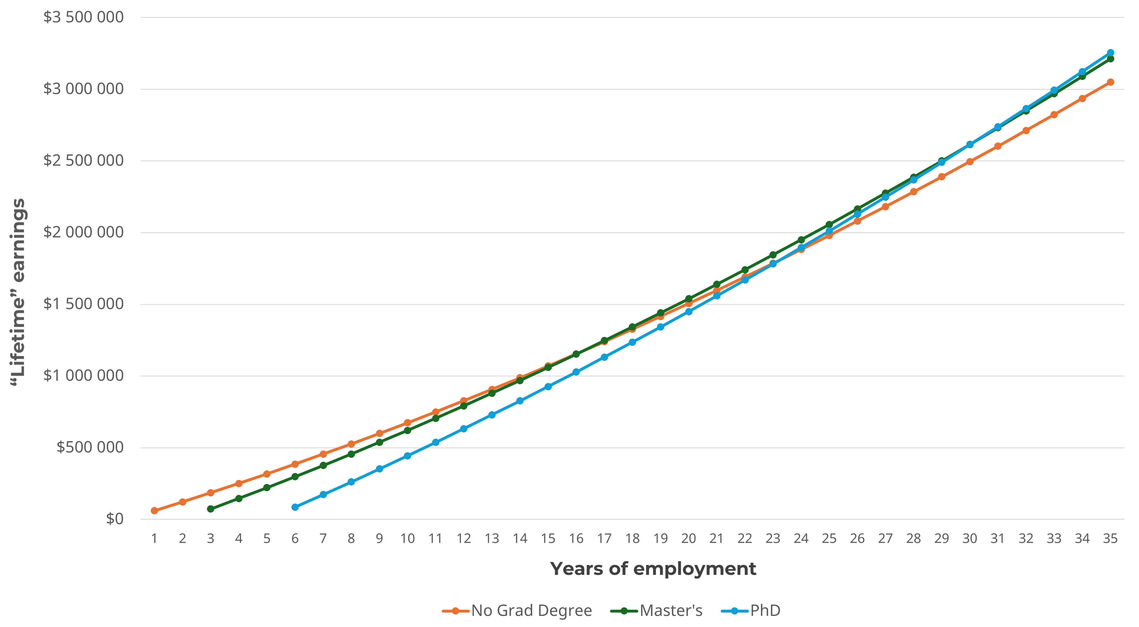Figure 1 shows a simplified model of the opportunity cost of graduate education with lines for no graduate degree, master’s degree only (assumed to take two years), and PhD (assumed to take an additional three years).