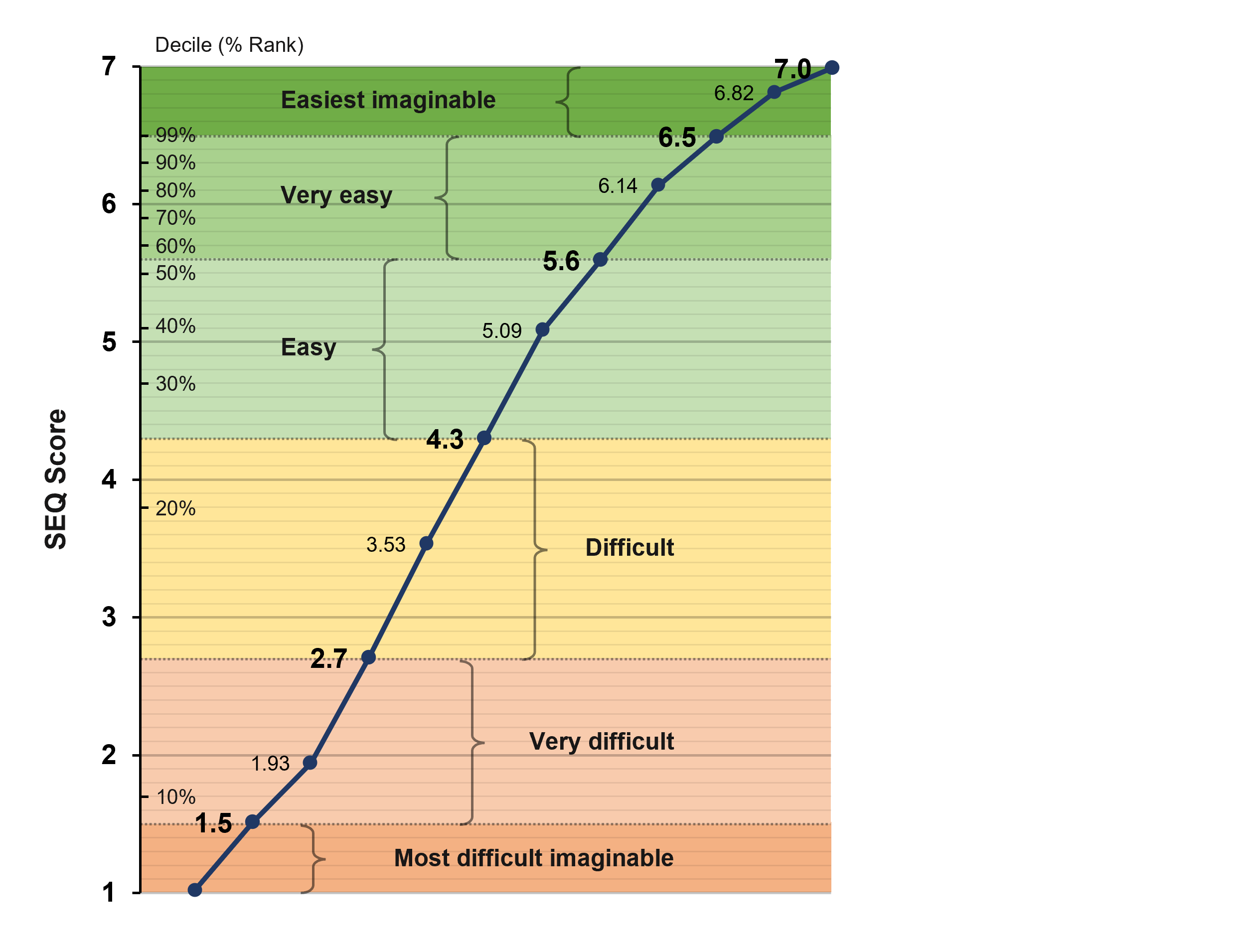 How it’s interpreted: The mean is calculated across participants (e.g., 5.1) and can be interpreted by itself, compared to other tasks, compared to the same task performed on different products, or compared to historical scores. The historical mean across several hundred tasks is 5.5. For easy interpretation, Figure 3 shows the correspondence between the SEQ and an adjective scale plus its historical deciles (every 10th percentile).