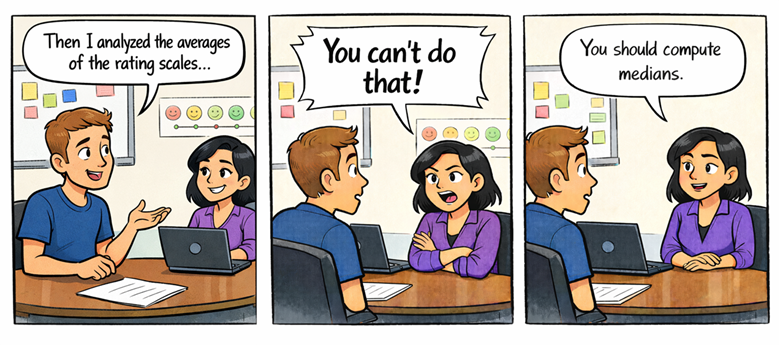 So, which is it—not all numbers are equal (Stevens, 1946), or the numbers don’t remember where they came from (Lord, 1953)? Given our backgrounds in applied statistics (and personal experiences attempting to act in accordance with Stevens’ reasoning that didn’t work out very well—that’s a story for another day), we fall firmly in the camp that supports the use of statistical techniques (such as the t-test, analysis of variance, and factor analysis) on ordinal data such as multipoint rating scales. However, you can’t just ignore the level of measurement of your data.