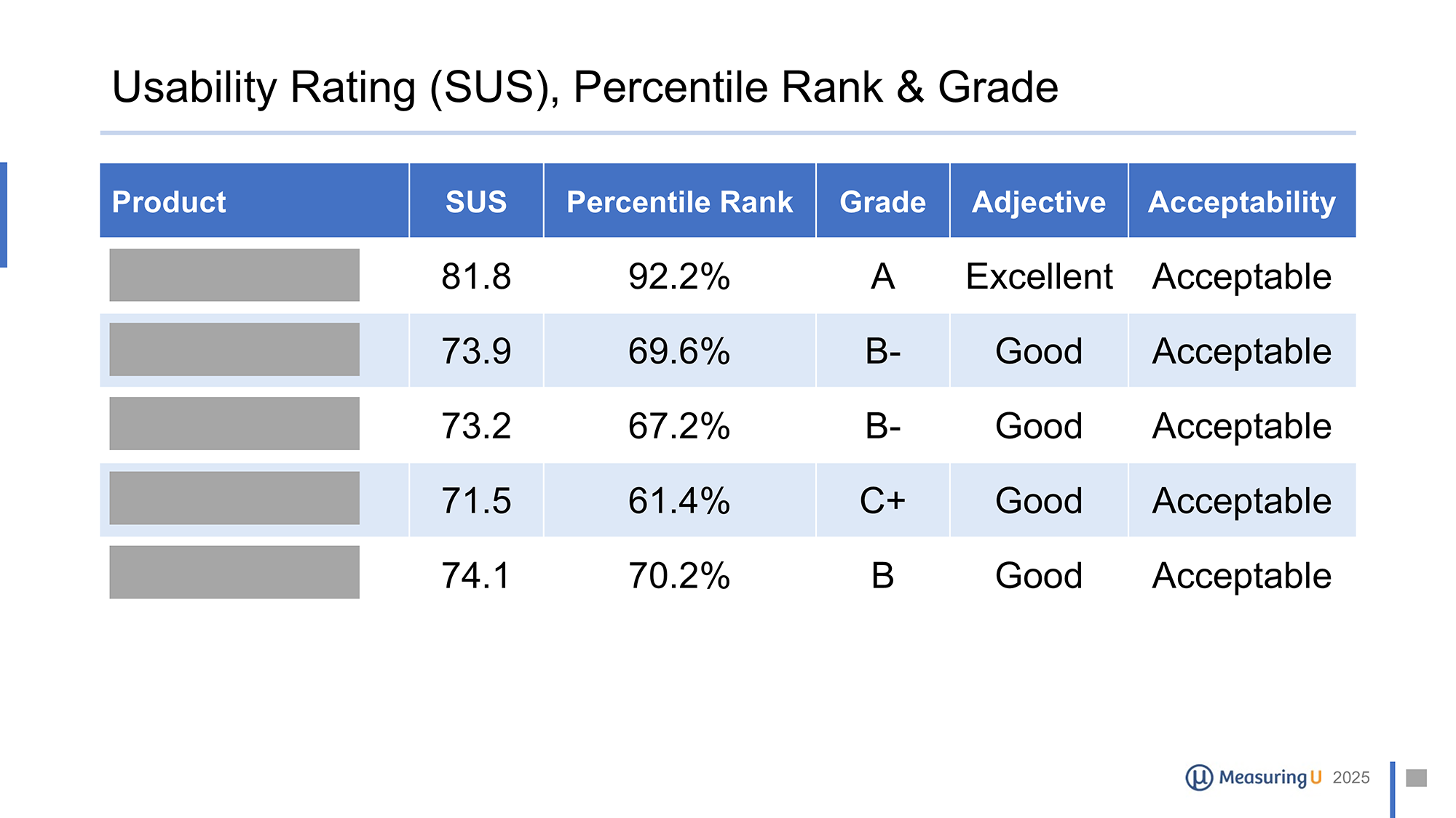 - SUS Scores: Perceived Usability is a key driver of customer loyalty. The System Usability Scale (SUS) is a standardized usability questionnaire widely used in software usability. The report contains raw SUS scores, converted percentile ranks, and corresponding letter grades.