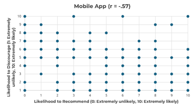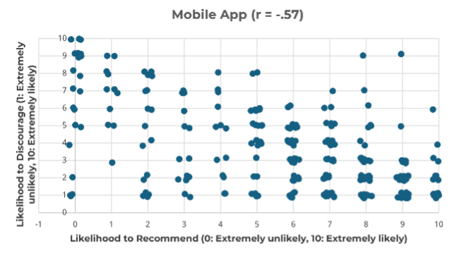 Figure 5: Standard (left) and jittered (right) scatterplots for ratings of likelihood to recommend and likelihood to discourage.