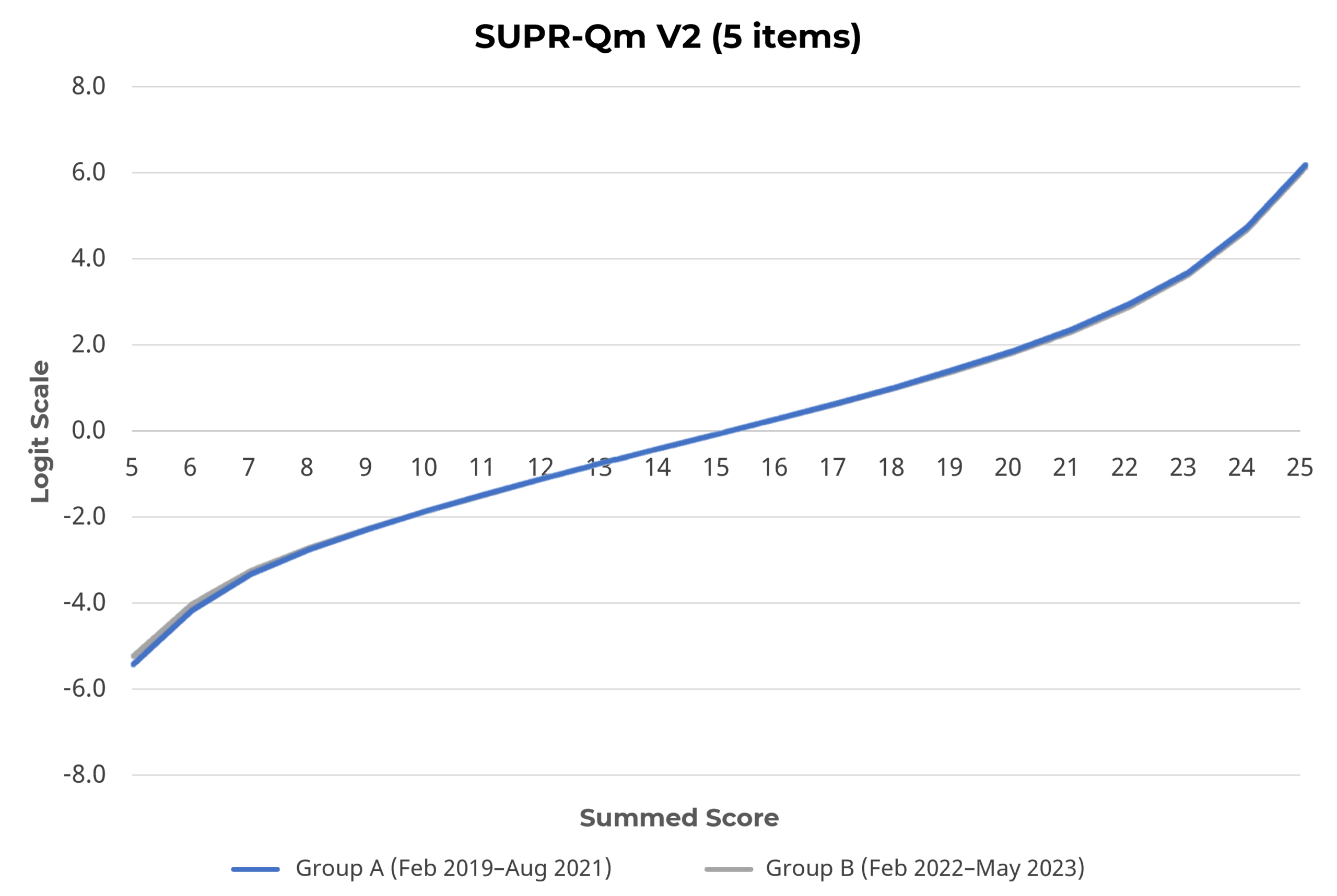Figure 2: Stability of Rasch scale for SUPR-Qm V2, indicated by the overlap of lines for Groups A and B.