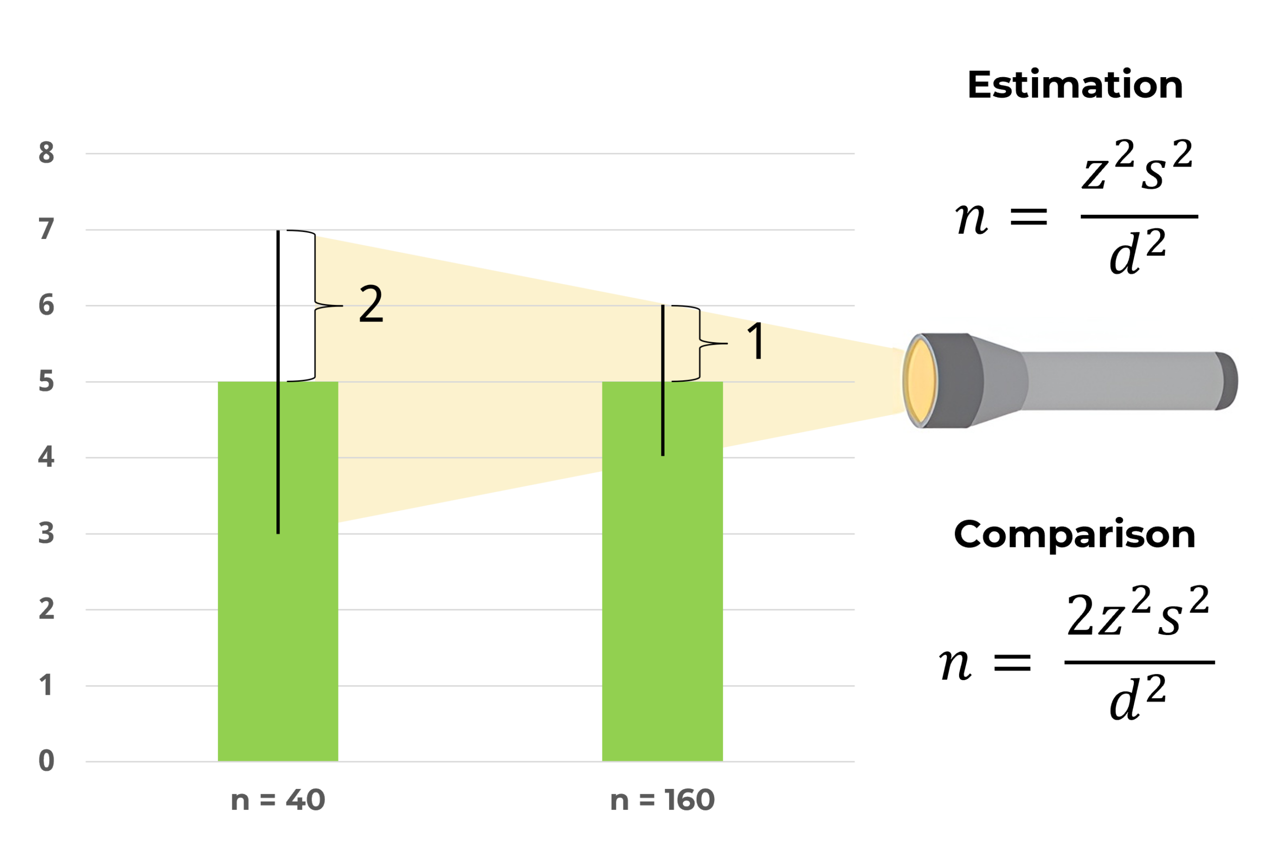 Figure 4: Quadrupling the sample size cuts measurement error in half—in other words, doubling the precision.