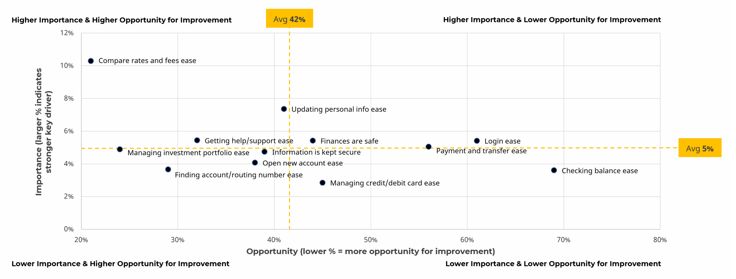 Figure 6: Scatterplot of importance and opportunity for improvement of key drivers of the international bank website experience.