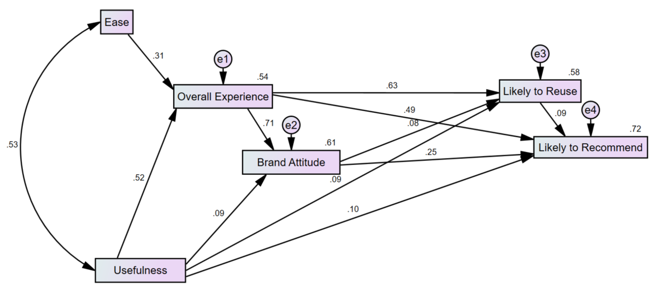 Figure 7: Structural equation model demonstrating the impact of perceived ease and usefulness on intentions to reuse and recommend (all beta weights significant, p < .001; excellent fit statistics, 𝜒2(3) = 0.9, p = .82; CFI = 1.0; RMSEA = .00; BIC = 124.9).