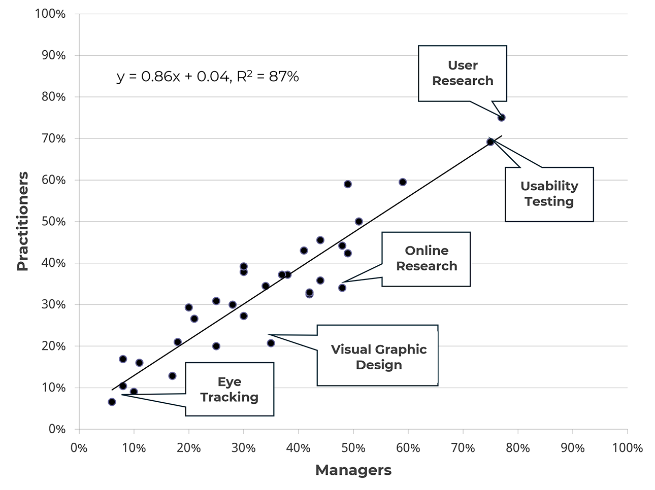 Figure 8: Scatterplot of skills UX managers wanted to hire in 2025 and the skills UX practitioners reported using in 2024.
